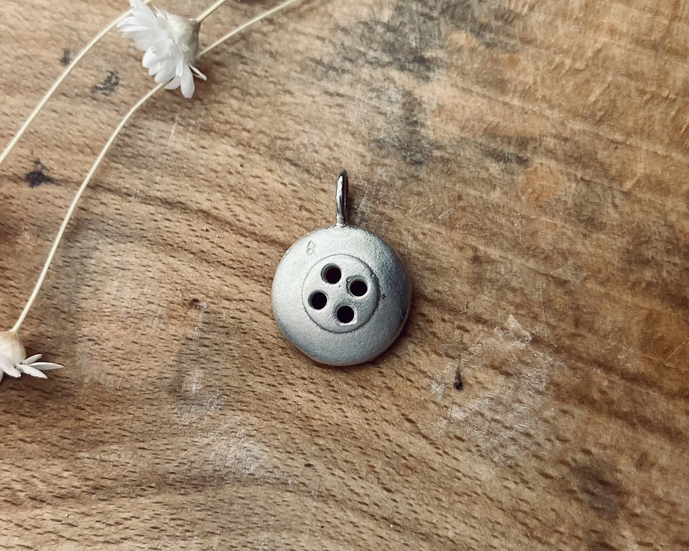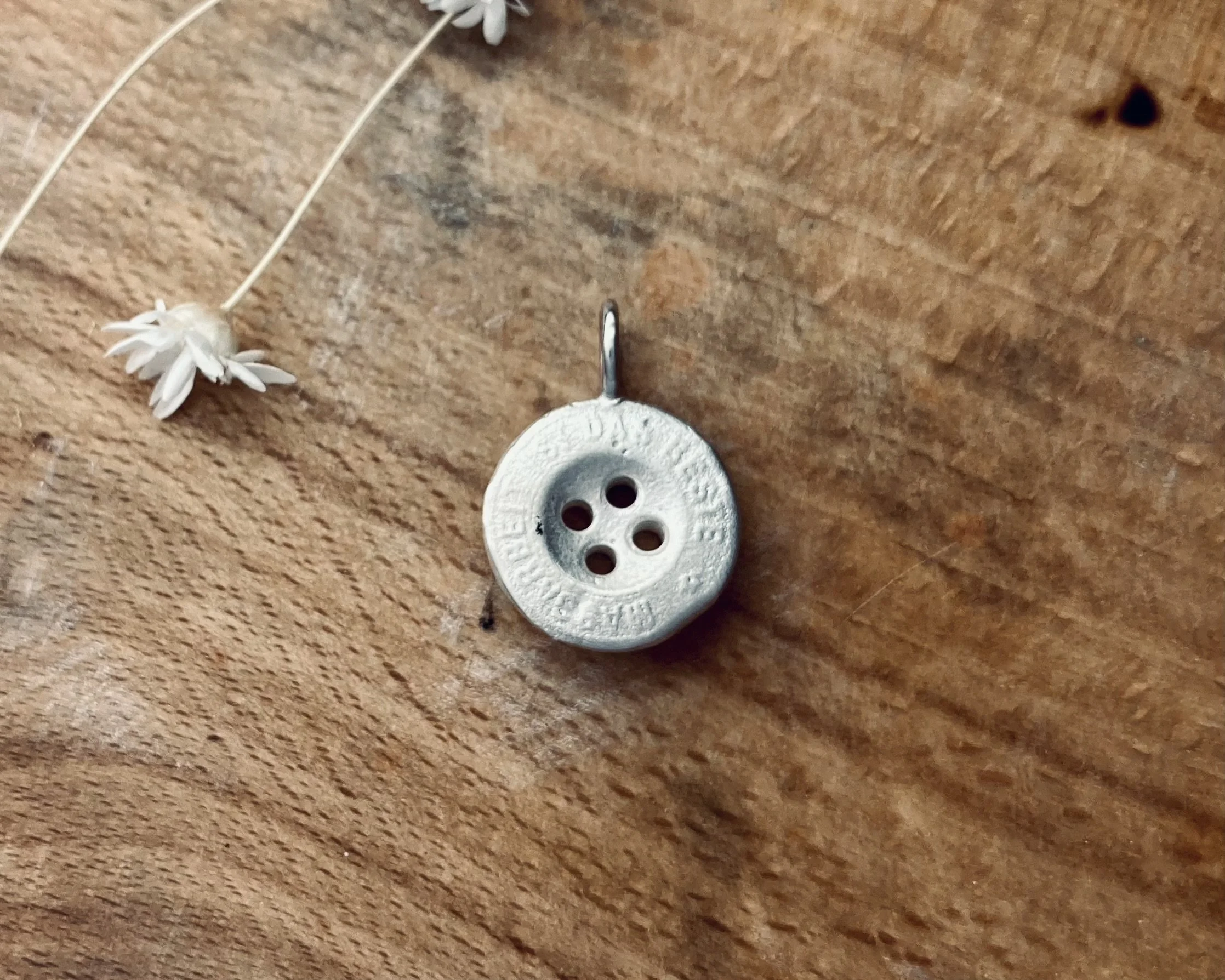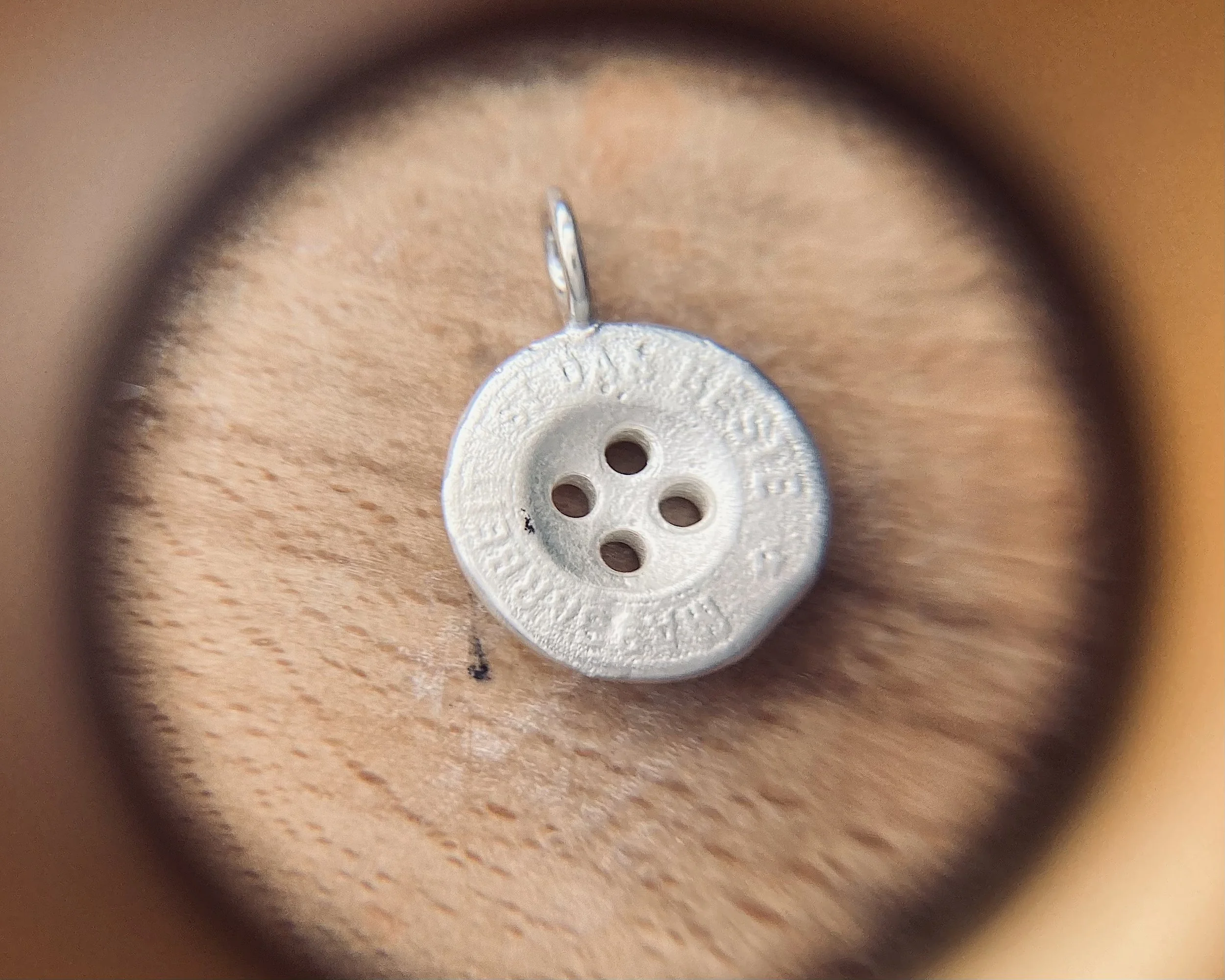 Dieses Schmuckstück ist aus 925/- Silber gemacht. Das Original ist ein Knopf auf dem Maßarbeit ist das Beste geschrieben steht. Der Schriftzug ist bei genauem Hinsehen noch lesbar. Er hat eine große Lauföse, sodass er an einer schon vorhandenen Kette getragen werden kann.